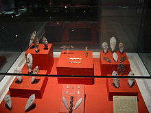 Another theme exhibited in this hall is autosacrifice, a ritual that was conducted in private as a personal act of communication with the gods. Widespread throughout the entire population, this practice was performed by perforating certain fleshy parts of the body—such as the earlobes, lips, tongue, chest, calves, et cetera—with obsidian blades, agave needles or bone perforators. Once the implement was covered with blood, it was inserted in straw balls called Zacatapayoli. The entirety was probably placed in ceremonial boxes—tepetlacalli—as an offering to the gods. Objects associated with human sacrifice are the "face blades" or knives decorated with eyes and teeth, as well as skull masks. Other ceremonial items include musical instruments, jewelry, and braziers for the burning of copal.[24]