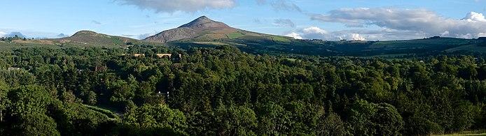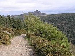 Great Sugar Loaf (Irish: Ó Cualann, meaning "lump of Cualu")[2] at 501 metres (1,644 ft), is the 404th–highest peak in Ireland on the Arderin scale,[3] however, being below 600 m it does not rank on the Vandeleur-Lynam or Hewitt scales.[4][5] The mountain is in the far northeastern section of the Wicklow Mountains, in Ireland, and overlooks the village of Kilmacanogue. The profile of the mountain means it can be mistaken for a dormant volcano. It owes its distinctive shape, however, to the erosion-resistant metamorphosed deep-sea sedimentary deposit from which its quartzite composition was derived.[6]