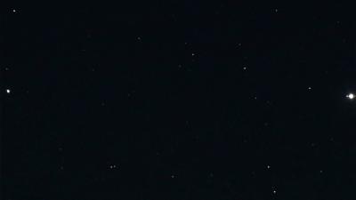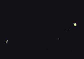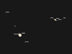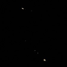 Photograph of the great conjunction of 2020 taken two days before closest approach with the four Galilean moons visible around Jupiter. (Titan can also be seen to the right of Saturn.)