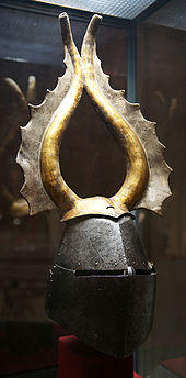The great helm ultimately evolved from the nasal helmet, which had been produced in a flat-topped variant with a square profile by about 1180.[1] From this type of helmet an intermediate type, called an 'enclosed helmet' or 'primitive great helm', developed near the end of the 12th century. In this helmet the expansion of the nasal produced a full face-plate, pierced for sight and breathing. This helmet was largely superseded by the true great helm by c. 1240.[2]
