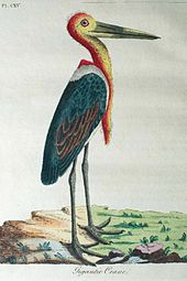 John Latham wrote about the bird found in Calcutta based on descriptions in Ives's Voyage to India published in 1773 and included an illustration in the first supplement to his General Synopsis of Birds. The illustration was based on a drawing in Lady Impey's collection. Latham called it the "gigantic crane", and included observations by an African traveller named Smeathman who described a similar bird from western Africa. Johann Friedrich Gmelin used Latham's description and described the Indian bird as Ardea dubia in 1789 while Latham later used the name Ardea argala for the Indian bird. Temminck used the name Ciconia marabou in 1824 based on the local name used in Senegal for the African bird and this was also applied to the Indian species. This led to considerable confusion between the African and Indian species.[16][17] The marabou stork of Africa looks somewhat similar but their disjunct distribution ranges, differences in bill structure, plumage, and display behaviour support their treatment as separate species.[18]