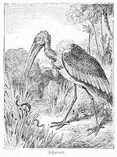 Aelian described the bird in 250 AD in his De Natura Animalium as the kilas (κηλας), a large bird from India with a crop that looks like a leather bag.[51] Babur described it in his memoirs under the name of ding.[52] In Victorian times the greater adjutant was known as the gigantic crane and later as the Asiatic marabou. It was very common in Calcutta during the rainy season and large numbers could be seen at garbage sites and also standing on the top of buildings. In Bihar, the bird is associated with the mythical bird garuda.[27] Its name hargila in Bengal and Assam is said to be derived from the Sanskrit roots had for "bone" and gila - "to swallow"- and describes the bird as a "bone swallower".[53][54] John Latham used the Latinized form as the species epithet in the binomial name, Ardea argala.[55] At that time it was believed that the birds were protected by the souls of dead Brahmins. Young British soldiers were known to harass these birds for fun, even blowing up birds by feeding them meat containing bones packed with a cartridge and fuse.[56] The birds would remain calm when natives passed by but would bark in alarm at those in European clothes.[57] The birds in Calcutta were considered to be efficient scavengers and an act was passed to protect them. Anyone who injured or killed a bird had to pay a hefty fine of fifty rupees.[58][59][60] The coat of arms of the city of Calcutta issued through two patents on 26 December 1896 included two adjutant birds with serpents in their beaks and charged on their shoulder with an Eastern Crown as supporters. The motto read "Per ardua stabilis esto", Latin for "steadfast through trouble".[61] The arms were included in the logo of official bodies such as the Calcutta Municipal Corporation and the Calcutta Scottish regiment.[62] Captured birds, probably from Calcutta, reached menageries in Europe during this period.[63][64][65][66]