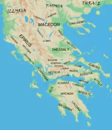 Homer refers to the "Hellenes" (/ˈhɛliːnz/) as a relatively small tribe settled in Thessalic Phthia, with its warriors under the command of Achilleus.[157] The Parian Chronicle says that Phthia was the homeland of the Hellenes and that this name was given to those previously called Greeks (Γραικοί).[158] In Greek mythology, Hellen, the patriarch of the Hellenes who ruled around Phthia, was the son of Pyrrha and Deucalion, the only survivors after the Great Deluge.[159] The Greek philosopher Aristotle names ancient Hellas as an area in Epirus between Dodona and the Achelous river, the location of the Great Deluge of Deucalion, a land occupied by the Selloi and the "Greeks" who later came to be known as "Hellenes".[160] In the Homeric tradition, the Selloi were the priests of Dodonian Zeus.[161]