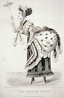 The stoop or the silhouette created by the fashion in women's dress for corsets, crinolettes and bustles by 1869 was also called the Grecian bend.[4][5][6] Contemporary illustrations often show a woman with a large bustle and a very small parasol, bending forward.