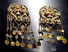 - ^ On the image of the Greek kneeling warrior: "A bronze figurine of a kneeling warrior, not Greek work, but wearing a version of the Greek Phrygian helmet ... From a burial, said to be of the 4th century BC, just north of the Tien Shan range". Ürümqi Xinjiang Museum. (Boardman "The diffusion of Classical Art in Antiquity")