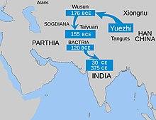 - ^ "They are a nation of nomads, moving from place to place with their herds, and their customs are like those of the Xiongnu. They have some 100,000 or 200,000 archer warriors... The Yuezhi originally lived in the area between the Qilian or Heavenly mountains and Dunhuang, but after they were defeated by the Xiongnu they moved far away to the west, beyond Dayuan, where they attacked and conquered the people of Daxia (Bactria) and set up the court of their king on the northern bank of the Gui (Oxus) river" ("Records of the Great Historian", Sima Qian, trans. Burton Watson, p234)