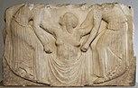 Geometric designs on pottery of the eighth-century BC depict scenes from the Trojan cycle, as well as the adventures of Heracles.[3] These visual representations of myths are important for two reasons. Firstly, many Greek myths are attested on vases earlier than in literary sources: of the twelve labors of Heracles, for example, only the Cerberus adventure occurs in a contemporary literary text.[13] Secondly, visual sources sometimes represent myths or mythical scenes that are not attested in any extant literary source. In some cases, the first known representation of a myth in geometric art predates its first known representation in late archaic poetry, by several centuries.[5] In the Archaic (c. 750 – c. 500 BC), Classical (c. 480–323 BC), and Hellenistic (323–146 BC) periods, Homeric and various other mythological scenes appear, supplementing the existing literary evidence.[3]