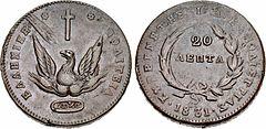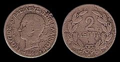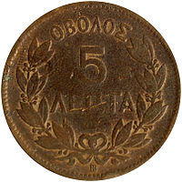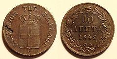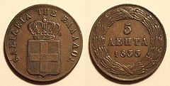 In modern Greece, lepton (modern form: lepto, λεπτό) is the name of the 1/100 denomination of all the official currencies of the Greek state: the phoenix (1827–1832), the drachma (1832–2001) and the euro (2002–current) – the name is the Greek form of "euro cent". Its unofficial currency sign is Λ (lambda).[1] Since the late 1870s, and until the introduction of the euro in 2001, no Greek coin had been minted with a denomination lower than 5 lepta.
