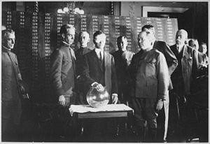 On July 20, 1917, a blindfolded Newton D. Baker, the Wilson administration's Secretary of War, drew numbers choosing certain registered young men for mandatory military service. Opponents of the war continued their efforts to change America's course by holding meetings and distributing pamphlets.[7] Among the leading organized forces in opposition to conscription and the war was the Socialist Party of America, whose April 1917 National Convention had declared its "unalterable opposition" to the war and urged the workers of the world to "refuse support to the governments in their wars."[8]