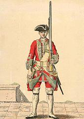 When the War of the Austrian Succession began in 1740, the regiment was based in Edinburgh; by 1744, many of its men were Scots and recruiting officers warned to exclude 'Jacobites and Irish Papists.'[5] The unit was then commanded by Charles Howard and thus known as 'Howard's Regiment'; when it joined the army in Flanders, this clashed with another regiment also commanded by a Howard. To avoid confusion, they were referred to by the colour of their facings, one becoming 'Green Howards' and the other, 'Buff Howards'.[6]