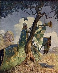 Characters similar to the Green Knight appear in several other works. In Thomas Malory's Le Morte d'Arthur, for example, Gawain's brother Gareth defeats four brothers in different coloured armour, including a "Grene Knyght", Sir Partolope.[9] The three who survive the encounter eventually join the Round Table and appear several further times in the text. The stories of Saladin feature a certain "Green Knight"; a Spanish warrior (maybe from Castile, according to an Arab source) in a shield vert and a helmet adorned with stag horns. Saladin tries to make him part of his personal guard.[10] Similarly, a "Chevalier Vert" appears in the Chronicle of Ernoul during the recollection of events following the capture of Jerusalem in 1187; here, he is identified as a Spanish knight who earned this nickname from the Muslims due to his eccentric apparel.[11]
