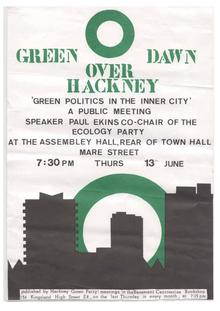1985 was a time of political change in the UK. After the formation of the Social Democratic Party (SDP), there were noises being made that the UK needed a "green" party. In response to the rumours that a group of Liberal Party activists were about to launch a UK 'Green Party',[3] HELP (the Hackney Local Ecology Party) registered the name The Green Party, with a green circle, designed by Steve O’Brien, as its logo. The first public meeting, chaired by David Fitzpatrick (then an Ecology Party speaker), was 13 June 1985 in Hackney Town Hall. Paul Ekins (then co-chair of the Ecology Party) spoke on the subject of Green politics and the inner city. Hackney Green Party put a formal proposal to the Ecology Party Autumn Conference in Dover that year to change to the Green Party, which was supported by the majority of attendees, including John Abineri, formerly an actor in the BBC series Survivors who supported adding Green to the name to fall in line with other environmental parties in Europe.[4]