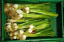 In Catalan cuisine, calçot is a type of onion traditionally eaten in a calçotada (plural: calçotades). A popular gastronomic event of the same name is held between the end of winter and early spring, where calçots are grilled, dipped in salvitxada or romesco sauce, and consumed in massive quantities.[10][11]