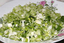 In the United Kingdom, scallions are sometimes chopped and added to mashed potatoes, known as champ particularly in Northern Ireland, or as an added ingredient to potato salad.