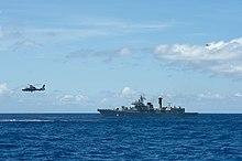 The Royal Australian Navy is well established as a green-water navy.[8][9] The navy sustains a broad range of maritime operations, from the Middle East to the Pacific Ocean, often as part of international or allied coalitions.[10] The RAN operates a modern fleet, consisting of destroyers, frigates, conventional submarines as well as an emerging amphibious and power projection capability based on the commissioning of HMAS Choules and two Canberra-class landing helicopter docks.[11]