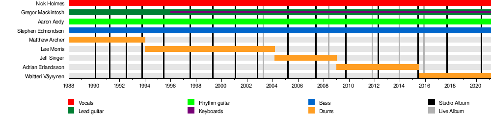 Their line-up has remained stable for such a long-standing heavy metal band, consisting of singer Nick Holmes, guitarists Greg Mackintosh and Aaron Aedy, and bassist Steve Edmondson. Holmes and Mackintosh are the principal composers, with almost all of the band's songs credited to them. During the years, the band has only changed drummers.