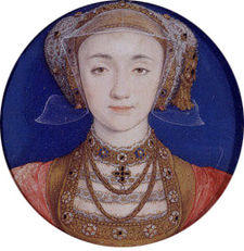 Historian Derek Wilson has observed that in marrying his son Gregory to the then queen's younger sister, Thomas Cromwell became "related by marriage to the king, an event well worth recording for posterity by a portrait of his daughter-in-law."[83] A portrait by Hans Holbein dated circa 1535–1540 exhibited at the Toledo Museum of Art as Portrait of a Lady, Probably a Member of the Cromwell Family (1926.57), once thought to be Queen Catherine Howard, may instead depict the wife of Gregory Cromwell.[75][76][84] The lady is wearing a French hood, her sleeves are said to follow a style set by Anne of Cleves and she has wonderful blackwork decorating her cuffs.[85] Born in around 1518, Elizabeth was probably in her 21st year in 1539 or 1540 and about the right age to be the sitter.[1][76] The portrait may have been commissioned by Thomas Cromwell between January 1540 and early June 1540 when Anne of Cleves was queen consort and before his arrest. It is also possible that a portrait of Gregory was painted at the same time and has not survived.