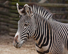 Fossils of zebra-like equids have been found throughout Africa and Asia in the Pliocene and Pleistocene deposits.[5] Notable examples include E. sanmeniensis from China, E. cautleyi from India, E. valeriani from central Asia and E. oldowayensis from East Africa.[5] The latter, in particular is very similar to the Grévy's zebra and may have been its ancestor.[5] The modern Grévy's zebra arose in the early Pleistocene.[5] Zebras appear to be a monophyletic lineage[7][8][9] and recent (2013) phylogenies have placed Grevy's zebra in a sister taxon with the plains zebra.[7] In areas where Grévy's zebras are sympatric with plains zebras, the two may gather in same herds[10] and fertile hybrids do occur.[11]