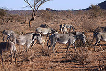 The Grévy's zebra largely inhabits northern Kenya, with some isolated populations in Ethiopia.[14]:147[15] It was extirpated from Somalia and Djibouti and its status in South Sudan is uncertain.[3] It lives in Acacia-Commiphora bushlands and barren plains.[10] Ecologically, this species is intermediate between the arid-living African wild ass and the water-dependent plains zebra.[10][14]:147 Lactating mares and non-territorial stallions use areas with green, short grass and medium, dense bush more often than non-lactating mares and territorial stallions.[19]