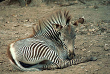 As with all zebra species, the Grevy's zebra's pelage has a black and white striping pattern. The stripes are narrow and close-set, being broader on the neck, and they extend to the hooves.[15] The belly and the area around the base of the tail lack stripes and are just white in color, which is unique to the Grevy's zebra. Due to the stripes being closer together and thinner than most of the other zebras, it is easier for them to make a good escape and to hide from predators.[16] Foals are born with brown and white striping, with the brown stripes darkening as they grow older.[15] Embryological evidence has shown that the zebra's background colour is dark and the white is an addition.[5] The stripes of the zebra may serve to make it look bigger than it actually is or disrupt its outline. It appears that a stationary zebra can be inconspicuous at night or in shade.[15] Experiments have suggested that the stripes polarize light in such a way that it discourages biting horse-flies in a manner not shown with other coat patterns.[17] Other studies suggest that, when moving, the stripes may confuse observers, such as mammalian predators and biting insects, via two visual illusions, the wagon wheel effect, where the perceived motion is inverted, and the barber pole illusion, where the perceived motion is in a wrong direction.[18]