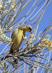 The grey-headed honeyeater mostly frequents Eucalyptus scrub and woodlands in stony hill country and timbered gullies within ranges; however, it can be observed on sand-plains, when vegetation is flowering.[8] The species has also been recorded in mulga and mallee woodlands, riverine areas dominated by River Red Gum (Eucalyptus camaldulensis), and occasionally in Mitchell grasslands.[9]