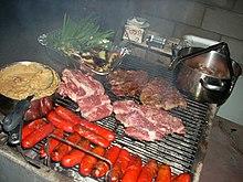 In Northern Mexico, carne asada (Spanish for "grilled meat") is a staple food. Popular cuts include arrachera, beefsteak and rib eye, as well as chorizo and chicken, among others. Charcoal, mesquite or firewood are used for the grilling.[8]