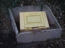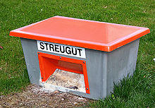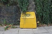 A grit bin, salt bin or sand bin is an item of street furniture, commonly found in countries where freezing temperatures and snowfall occur, which holds a mixture of salt and grit that is spread over roads if they have snow or ice on them. Spreading rock salt over roads and pathways is commonly done either by hand or with a winter service vehicle and helps improve road safety in frosty conditions. The salt helps reduce the freezing temperature of the ice, which can be effective in temperatures of up to -9°C. [1] Roads that are not gritted during winter are much more dangerous for vehicles and foot traffic and so busy routes can be gritted several times per day under harsh snowy conditions.