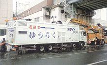 A snow-melting vehicle works by scooping snow into a melting pit located in a large tank at the rear of the vehicle. Around the melting pit is a thin jacket full of warm water, heated by a powerful burner. The gases from the burner are bubbled through the water, causing some of the heated water to spill over into the melting pit, melting the snow instantly. The meltwater is discharged into the storm drains.[47]