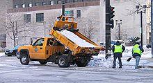 A gritter, also known as a sander,[34] salt spreader or salt truck,[3] is found on most winter service vehicles. Indeed, the gritter is so commonly seen on winter service vehicles that the terms are sometimes used synonymously.[1] Gritters are used to spread grit (rock salt), onto roads. The grit is stored in the large hopper on the rear of the vehicle, with a wire mesh over the top to prevent foreign objects from entering the spreading mechanism and hence becoming jammed. The salt is generally spread across the roadway by an impeller, attached by a hydraulic drive system to a small onboard engine. However, until the 1970s, the grit was often spread manually using shovels by men riding on the back of the truck, and some older spreading mechanisms still require grit be manually loaded into the impeller from the hopper.[17][35]