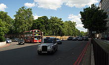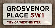 Grosvenor Place is a street in London, running from Hyde Park Corner down the west side of Buckingham Palace gardens, and joining lower Grosvenor Place where there are some cafes and restaurants. It joins Grosvenor Gardens to the south, which links it to Victoria railway station. At No. 17 is the embassy of the Republic of Ireland.