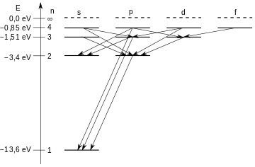 A Grotrian diagram of the hydrogen atom. Only transitions between adjacent columns are allowed, as per the selection rule .