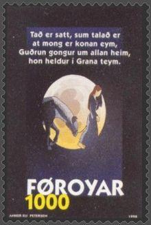 Her mother Grimhild[11] asked her sons Gunnarr and Högni what kind of wergild they would like to give their sister for the killing of her husband Sigurd and her son Sigmund, and they were both ready to compensate their sister.[12] Guðrún met her mother, brothers and Valdar, the king of Denmark, and three men named Jarizleif, Eymoth and Jarizskar.[13]
