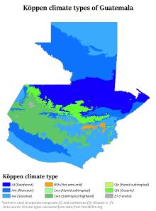 The first evidence of human habitation in Guatemala dates to 12,000 BC. Archeological evidence, such as obsidian arrowheads found in various parts of the country, suggests a human presence as early as 18,000 BC.[18] There is archaeological proof that early Guatemalan settlers were hunter-gatherers. Pollen samples from Petén and the Pacific coast indicate that maize cultivation had been developed by the people by 3500 BC.[19] Sites dating to 6500 BC have been found in the Quiché region in the Highlands, and Sipacate and Escuintla on the central Pacific coast.