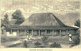 The Mission Station at Goobbe was started in April 1837, with Thomas Hodson and his wife moving to Goobbe. Initially they lived in tents, and after a while built mud cottages with thatched roof (see figure). The mud walls of the house were 6 ft. high, and the house had a few small rooms. The house was cool during the hot seasons, but leaked during the rains. Further, Hodson provides a description of the village life at Goobbe. Low flat lands well irrigated from a tank grew paddy. There were also large clumps of trees and large tracts of un-cultivated land, which was used as common pasture lands for sheep and cows. The shepherd boys usually had a hand made flute and played a sweet tone. Deer were common and were seen fleeting outside the mission house.