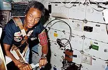 Bluford was selected to become a NASA astronaut in January 1978 as a part of NASA astronaut group 8.[8] They trained for a year and were officially designated as astronauts in August 1979.[5][9] His technical assignments have included working with Space Station operations, the Remote Manipulator System (RMS), Spacelab systems and experiments, Space Shuttle systems, payload safety issues and verifying flight software in the Shuttle Avionics Integration Laboratory (SAIL) and in the Flight Systems Laboratory (FSL). Bluford was a mission specialist on STS-8, STS-61-A, STS-39, and STS-53.[7]
