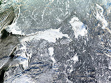 The gulf has an area of 30,000 km2 (12,000 sq mi).[2] The length (from the Hanko Peninsula to Saint Petersburg) is 400 km (250 mi) and the width varies from 70 km (43 mi) near the entrance to 130 km (81 mi) on the meridian of Moshchny Island; in the Neva Bay, it decreases to 12 km (7.5 mi). The gulf is relatively shallow, with the depth decreasing from the entrance to the gulf to the continent. The sharpest change occurs near Narva-Jõesuu, which is why this place is called the Narva wall. The average depth is 38 m (125 ft) with the maximum of 115 m (377 ft). The depth of the Neva Bay is less than 6 metres (20 ft); therefore, a channel was dug at the bottom for safe navigation. Because of the large influx of fresh water from rivers, especially from the Neva River (two-thirds of the total runoff), the gulf water has very low salinity – between 0.2 and 0.3 ‰ at the surface and 0.3–0.5 ‰ near the bottom. The average water temperature is close to 0 °C (32 °F) in winter; in summer, it is 15–17 °C (59–63 °F) at the surface and 2–3 °C (36–37 °F) at the bottom. Parts of the gulf can freeze from late November to late April; the freezing starts in the east and gradually proceeds to the west. Complete freezing usually occurs by late January, and it may not occur in mild winters.[3] Frequent strong western winds cause waves, surges of water and floods.[4][5]