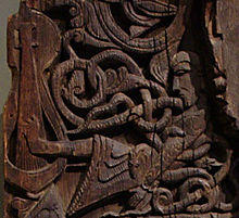 Seven additional images from Norway, Sweden, and the island of Gotland have been proposed to depict Gunnar in the snake pit, but without a harp: these images date from between the ninth and the eleventh centuries, and thus predate the secure attestations considerably.[68] The earliest of these proposed identifications are the carvings on the cart found with the ninth-century Oseberg Ship burial.[69] This identification is very controversial.[70] Guðmundsdóttir suggests that the picture stone Klinte Hunninge I from Gotland (ninth/tenth century) may depict a version of the story of Oddrun's aid to Gunnar, as it shows an unidentified female figure by the snake pit.[68] She argues in favor of identifying the figure in the snake pit in all of these images with Gunnar, noting their apparent shared iconography.[71] Guðmundsdóttir nevertheless dismisses a number of other proposed images of Gunnar, on the grounds that they are not clear.[72]