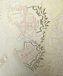 - An early 19th-century gateway stands behind the Vulcan building, indicating the line of the original boundary of the New Gun Wharf;[7] Initially hemmed in by the fortifications of Old Portsmouth, the site expanded further when the town fortifications were levelled in the 1870s; much of the later perimeter wall, which dates from this expansion, remains in place around the edge of the site, along with the Main Gate of c.1870.[8]