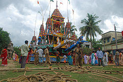Ratha Yatra is the main attraction. At approximately 2 km, the Guptipara Ratha covers the second largest distance in India.[7] It starts from the temple complex in Lord Brindaban Chandra Temple and stretches to Lord Gopal Temple at Borobazar, Guptipara. Approximately one million people gather there to celebrate the Ratha Yatra.