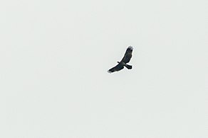 This eagle is a fairly large species, though mid-sized as a member of the genus Aquila. It is mainly dark brown to black, with paler undersides to its flight feathers and a rounded tail. Its body length is 74–86 cm (29–34 in) with a wingspan of between 1.65 and 1.9 m (5.4 and 6.2 ft). One immature bird reportedly weighed 3.06 kg (6.7 lb).[3] Females are larger than males. Its wings are held level when gliding. It feeds on mammals (such as cuscuses), reptiles, fish, and birds.