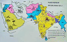 During first quarter of the 16th century, Nanak went on long udasiya ('journeys') for spiritual pursuits. A verse authored by him states that he visited several places in "nau-khand" ('the nine regions of the earth'), presumably the major Hindu and Muslim pilgrimage centres.[25]