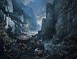 Doré's illustrations for the Bible (1866) were a great success, and in 1867 Doré had a major exhibition of his work in London. This exhibition led to the foundation of the Doré Gallery in Bond Street, London.[11] In 1869, Blanchard Jerrold, the son of Douglas William Jerrold, suggested that they work together to produce a comprehensive portrait of London. Jerrold had obtained the idea from The Microcosm of London produced by Rudolph Ackermann, William Pyne, and Thomas Rowlandson (published in three volumes from 1808 to 1810).[12] Doré signed a five-year contract with the publishers Grant & Co that involved his staying in London for three months a year, and he received the vast sum of £10,000 a year for the project. Doré was mainly celebrated for his paintings in his day. His paintings remain world-renowned, but his woodcuts and engravings, like those he did for Jerrold, are where he excelled as an artist with an individual vision.