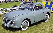 The small Gutbrod Superior model was produced from 1950 to 1954 using the company's own, front-mounted twin-cylinder two-stroke engines initially of 593cc. In April 1953 the engine size was increased to 663 cc for more expensive 'Luxus 700' versions of the car, while the standard model continued to be offered with the original smaller engine.[3] Claimed power output was 20 hp (15 kW) for the base version, while for the larger engine 26 hp (19 kW) or 30 hp (22 kW) was claimed according to whether fuel feed came via a carburettor or a form of fuel injection.[3] Press reports commended the speed and secure handling of the cars but indicated that the sporty handling came in return for sacrificing some comfort.[3] It was also noted that normal conversation became impossible at speeds above about 80 km/h (50 mph) due to the noise.[3]