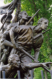 Another Borglum design is the North Carolina Monument on Seminary Ridge at the Gettysburg Battlefield in south-central Pennsylvania. The cast bronze sculpture depicts a wounded Confederate officer encouraging his men to push forward during Pickett's Charge. Borglum had also made arrangements for an airplane to fly over the monument during the dedication ceremony on July 3, 1929. During the sculpture's unveiling, the plane scattered roses across the field as a salute to those North Carolinians who had fought and died at Gettysburg.