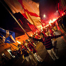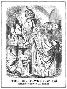 On several occasions during the 19th century The Times reported that the tradition was in decline, being "of late years almost forgotten", but in the opinion of historian David Cressy, such reports reflected "other Victorian trends", including a lessening of Protestant religious zeal—not general observance of the Fifth.[29] Civil unrest brought about by the union of the Kingdoms of Great Britain and Ireland in 1800 resulted in Parliament passing the Roman Catholic Relief Act 1829, which afforded Catholics greater civil rights, continuing the process of Catholic Emancipation in the two kingdoms.[35] The traditional denunciations of Catholicism had been in decline since the early 18th century,[36] and were thought by many, including Queen Victoria, to be outdated,[37] but the pope's restoration in 1850 of the English Catholic hierarchy gave renewed significance to 5 November, as demonstrated by the burnings of effigies of the new Catholic Archbishop of Westminster Nicholas Wiseman, and the pope. At Farringdon Market 14 effigies were processed from the Strand and over Westminster Bridge to Southwark, while extensive demonstrations were held throughout the suburbs of London.[38] Effigies of the 12 new English Catholic bishops were paraded through Exeter, already the scene of severe public disorder on each anniversary of the Fifth.[39] Gradually, however, such scenes became less popular. With little resistance in Parliament, the thanksgiving prayer of 5 November contained in the Anglican Book of Common Prayer was abolished, and in March 1859 the Anniversary Days Observance Act repealed the Observance of 5th November Act.[40][41][42]