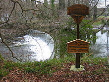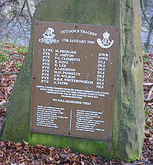 On 17 January 1945, ten soldiers drowned while taking part in a military exercise at Guyzance,[30] on the River Coquet. The river was in full flood and their boat was swept over Smeaton's weir, after which it capsized. The men, all aged 18, were weighed down by full combat gear.[31] In 1995, a memorial service was held to mark the 50th anniversary of the tragedy and a plaque was unveiled. The campaign for a memorial had been spearheaded by Burnett Seyburn, who had been a lance corporal at the time of the original tragedy, and Vera Vaggs, a Northumbrian historian. As well as raising money locally, they obtained support from the National Lottery, the War Graves Commission, local landowner Sir Anthony Milburn and the Asda supermarket chain.[32]