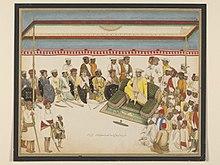 Jankojirao died in 1843; and in the absence of an heir, his widow Tara Bai adopted Bhagirath Rao, a son of Hanwant Rao, commonly called Babaji Sindhia. He succeeded under the name of Jayajirao Sindhia, the Mama Sahib being chosen as regent. Tara Bai, however, came under the influence of Dada Khasgiwala, the comptroller of her household, an unscrupulous adventurer who wished to get all power into his own hands. A complicated series of intrigues followed, which it is impossible to unravel. The Dada, however, succeeded in driving Mama Sahib from the state and became minister. He filled all appointments with his relatives, and matters rapidly passed from bad to worse, ending in the assemblage of large bodies of troops who threatened an attack on Sironj, where Mama Sahib was then residing. War was impending in the Punjab, and, as it was essential to secure peace, the British Government decided to interfere. Colonel Sleeman, the Resident, was withdrawn, and the surrender of Dada Khasgiwala was demanded.[11]