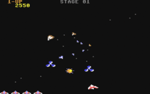 The majority of enemies are spaceships, which must be destroyed to complete a level. They appear either from the centre of the screen or from one of the edges, and move in swirling patterns. They can shoot the player's ship or destroy it by contact. They hover near the centre of the screen after completing their deployment pattern, and occasionally fly outwards and shoot at the player. If not destroyed by the player, the enemy ships gradually fly away one by one.