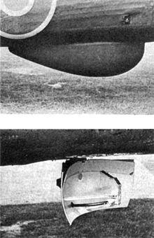 In early tests in April, the superiority of the scanning PPI system was evident, and all work on the older A-scope version ended.[2] H2S performed its first experimental flight on 23 April 1942, with the radar mounted in a Halifax bomber, V9977.[10] The scanning unit was installed in the aircraft's belly using the position previously occupied by the mid-under turret, which was by that time seldom installed. The rotating scanner mounting was designed and manufactured by Nash & Thompson. The scanning aerial was covered by a distinctive streamlined radome.[11]