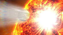 HD 189733 b is an exoplanet approximately 64.5 light-years away[2] from the Solar System in the constellation of Vulpecula. The planet was discovered orbiting the star HD 189733 on October 5, 2005, when astronomers in France observed the planet transiting across the face of the star.[3] With a mass 13% higher than that of Jupiter, HD 189733 b orbits its host star once every 2.2 days at an orbital speed of 152.5 kilometres per second (341,000 mph), making it a hot Jupiter with poor prospects for extraterrestrial life. Being the closest transiting hot Jupiter to Earth, HD 189733 b is a subject for extensive atmospheric examination. The atmosphere of HD 189733b has been extensively studied through high- and low-resolution instruments, both from ground and space.[4] HD 189733 b was the first extrasolar planet for which a thermal map was constructed, possibly to be detected through polarimetry,[5] to have its overall color determined (deep blue),[5][6] to have a transit detected in X-ray spectrum and to have carbon dioxide detected in its atmosphere.